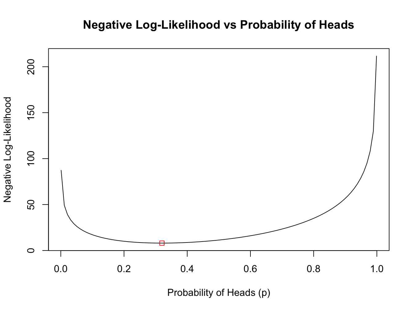 main = "Negative Log-Likelihood vs Probability of Heads")
